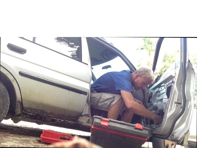 Wat te doen was de vraag? Achter de geraniums zitten is geen optie want die heb ik niet, vandaar dat ik een autohandeltje ben begonnen. Om het geheel enige aanzien te geven heb ik het YAP genoemd. De afkorting staat voor Yap Automobiel Project. YAP kent 2 activiteiten. De eerste is: oude defecte autos opkopen, repareren, oppoetsen en weer verkopen. De tweede is het repareren van autodorpels. Veel autos in Yap hebben doorgeroeste dorpels, hetgeen veroorzaakt wordt door de slechte wegen in combinatie met de zoute oceaan lucht. De locale werkwijze om het te repareren is het inlassen van een nieuwe dorpel. Een goede vakman kan het weer prima in orde maken maar het is duur. Mijn methode is een stuk goedkoper, ik maak namelijk een nieuwe dorpel van glasmat en epoxy. Alles bij elkaar kost het me 15 dollar aan materialen en het is binnen twee halve dag gepiept. Kosten voor de klant zijn 65 dollar. YAP loopt naar behoren, aan het eind van april hield ik zelfs een beetje geld over. Of het lang goed zal gaan valt echter te betwijfelen omdat de kans groot is dat de immigratiedienst die halve gare Hollander in de Yapse baai in de gaten houdt. Maar ja, het leven bestaat uit risicos, en bovendien moet je een avontuur wel een beetje spannend houden want anders is het geen avontuur meer.